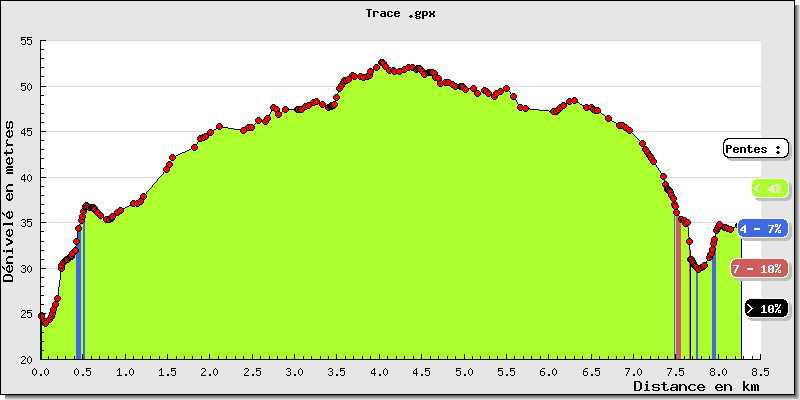 Le point culminant de la balade est proche de 52.60 m (et le plus bas à 23.90 m)